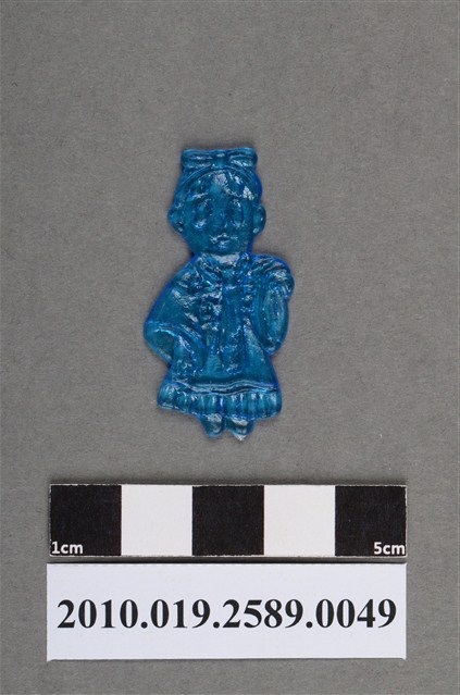 1.本物件為殭屍尪仔仙。硬質塑膠材質,扁平,單一藍色,雙面浮雕圖案,兩面圖案相同。圖案為Q版女性殭屍,因有橢圓形黑眼圈。其頭上梳有平髻髮型,穿著古代裙裝,裙長及腳,寬袖,胸前有1串長珠鍊和領巾。一手舉起,一手自然垂下,腳尖踮起。2.尪仔仙尺寸大致可分成小、中、大型,小型約長2-5公分,中型約長8-15公分,顏色以單色為主。有些大型的則可長達30公分左右,以菩薩、神仙和民間傳說故事人物等造型為主,塗上金銀紅黃彩漆等亮色。1960、70年代的尪仔仙多以民間傳說故事、歌仔戲、布袋戲人物為造型。1980年代改以卡通、電玩、漫畫人物造型為主。常見玩法之一為兩人(或多人)各持一只尪仔仙,輪流用手指彈射,看誰的尪仔仙先疊在對方上面,便可贏得對方用來對戰或是約定的尪仔仙。