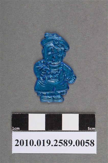 1.本物件為殭屍尪仔仙。硬質塑膠材質,扁平,單一藍色,雙面浮雕圖案,兩面圖案相同。圖案為Q版男性殭屍,因有橢圓形黑眼圈。其表情呈現疑惑貌,頭戴古代官帽,官帽上貼有1張符咒,符咒揚起,身穿古代官服,胸前有補子,身上掛有朝珠。一手往前舉,一手垂下。2.尪仔仙尺寸大致可分成小、中、大型,小型約長2-5公分,中型約長8-15公分,顏色以單色為主。有些大型的則可長達30公分左右,以菩薩、神仙和民間傳說故事人物等造型為主,塗上金銀紅黃彩漆等亮色。1960、70年代的尪仔仙多以民間傳說故事、歌仔戲、布袋戲人物為造型。1980年代改以卡通、電玩、漫畫人物造型為主。常見玩法之一為兩人(或多人)各持一只尪仔仙,輪流用手指彈射,看誰的尪仔仙先疊在對方上面,便可贏得對方用來對戰或是約定的尪仔仙。