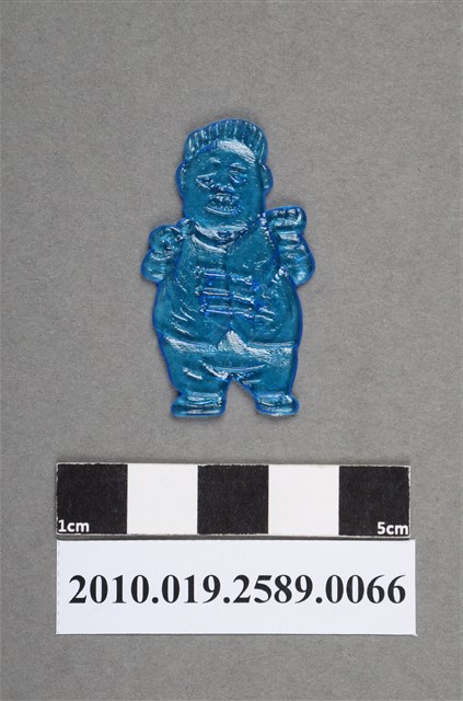 1.本物件為藍色人型尪仔仙。硬質塑膠材質,扁平,單一藍色,雙面浮雕圖案,兩面圖案相同。圖案為站立男性,嘴巴張開,身材胖,服裝在肩膀上有裝飾,雙手放在背後。2.尪仔仙尺寸大致可分成小、中、大型,小型約長2-5公分,中型約長8-15公分,顏色以單色為主。有些大型的則可長達30公分左右,以菩薩、神仙和民間傳說故事人物等造型為主,塗上金銀紅黃彩漆等亮色。1960、70年代的尪仔仙多以民間傳說故事、歌仔戲、布袋戲人物為造型。1980年代改以卡通、電玩、漫畫人物造型為主。常見玩法之一為兩人(或多人)各持一只尪仔仙,輪流用手指彈射,看誰的尪仔仙先疊在對方上面,便可贏得對方用來對戰或是約定的尪仔仙。