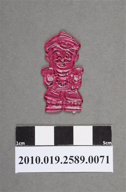 1.本物件為殭屍尪仔仙。硬質塑膠材質,扁平,單一紅色,雙面浮雕圖案,兩面圖案相同。圖案為Q版男性殭屍,因有橢圓形黑眼圈。其嘴巴張開,表情呈高興貌,頭戴古代官帽,官帽上貼有1張符咒,符咒揚起,身穿古代官服,胸前有補子,身上掛有朝珠,雙手往前舉起。