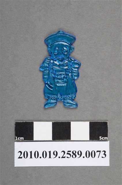 1.本物件為殭屍尪仔仙。硬質塑膠材質,扁平,單一藍色,雙面浮雕圖案,兩面圖案相同。圖案為Q版男性殭屍,因有橢圓形黑眼圈。其戴有官帽,口吐舌頭,身穿官服,胸前有補子,戴有朝珠,雙手往前舉起。2.尪仔仙尺寸大致可分成小、中、大型,小型約長2-5公分,中型約長8-15公分,顏色以單色為主。有些大型的則可長達30公分左右,以菩薩、神仙和民間傳說故事人物等造型為主,塗上金銀紅黃彩漆等亮色。1960、70年代的尪仔仙多以民間傳說故事、歌仔戲、布袋戲人物為造型。1980年代改以卡通、電玩、漫畫人物造型為主。常見玩法之一為兩人(或多人)各持一只尪仔仙,輪流用手指彈射,看誰的尪仔仙先疊在對方上面,便可贏得對方用來對戰或是約定的尪仔仙。