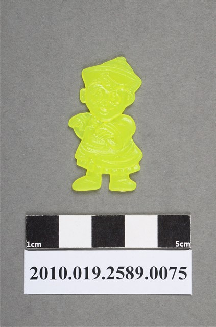 1.本物件為殭屍尪仔仙。硬質塑膠材質,扁平,單一不透明黃色,雙面浮雕圖案,兩面圖案相同。圖案為Q版男性殭屍,因有橢圓形黑眼圈。其戴有官帽,官帽上貼有1張符咒,符咒揚起,身穿官服,胸前戴有朝珠。身體有些側身,雙手往前舉起。2.尪仔仙尺寸大致可分成小、中、大型,小型約長2-5公分,中型約長8-15公分,顏色以單色為主。有些大型的則可長達30公分左右,以菩薩、神仙和民間傳說故事人物等造型為主,塗上金銀紅黃彩漆等亮色。1960、70年代的尪仔仙多以民間傳說故事、歌仔戲、布袋戲人物為造型。1980年代改以卡通、電玩、漫畫人物造型為主。常見玩法之一為兩人(或多人)各持一只尪仔仙,輪流用手指彈射,看誰的尪仔仙先疊在對方上面,便可贏得對方用來對戰或是約定的尪仔仙。