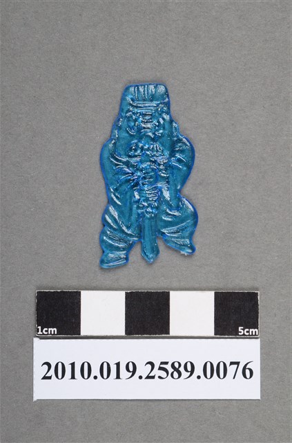 1.本物件為道士尪仔仙。硬質塑膠材質,扁平,單一藍色,雙面浮雕圖案,兩面圖案相同。圖案為站立的道士,頭戴斜頂道冠,表情嚴肅,雙手握著劍柄,劍尖抵地,一腳尖踮起。2.尪仔仙尺寸大致可分成小、中、大型,小型約長2-5公分,中型約長8-15公分,顏色以單色為主。有些大型的則可長達30公分左右,以菩薩、神仙和民間傳說故事人物等造型為主,塗上金銀紅黃彩漆等亮色。1960、70年代的尪仔仙多以民間傳說故事、歌仔戲、布袋戲人物為造型。1980年代改以卡通、電玩、漫畫人物造型為主。常見玩法之一為兩人(或多人)各持一只尪仔仙,輪流用手指彈射,看誰的尪仔仙先疊在對方上面,便可贏得對方用來對戰或是約定的尪仔仙。