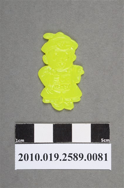 1.本物件為殭屍尪仔仙。硬質塑膠材質,扁平,單一不透明黃色,雙面浮雕圖案,兩面圖案相同。圖案為Q版男性殭屍,因有橢圓形黑眼圈。其嘴巴張開,表情呈開心貌,頭戴古代官帽,官帽上貼有1張符咒,符咒揚起,身穿古代官服,胸前有補子,身上掛有朝珠。一手往前舉,一手放胸前,腳尖踮起。2.尪仔仙尺寸大致可分成小、中、大型,小型約長2-5公分,中型約長8-15公分,顏色以單色為主。有些大型的則可長達30公分左右,以菩薩、神仙和民間傳說故事人物等造型為主,塗上金銀紅黃彩漆等亮色。1960、70年代的尪仔仙多以民間傳說故事、歌仔戲、布袋戲人物為造型。1980年代改以卡通、電玩、漫畫人物造型為主。常見玩法之一為兩人(或多人)各持一只尪仔仙,輪流用手指彈射,看誰的尪仔仙先疊在對方上面,便可贏得對方用來對戰或是約定的尪仔仙。