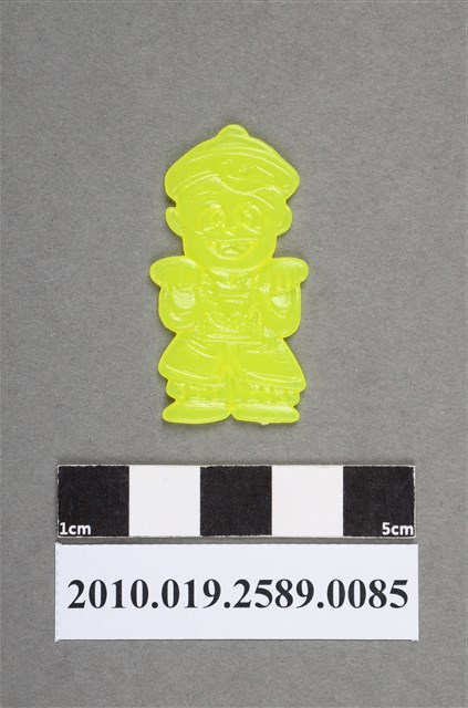 1.本物件為殭屍尪仔仙。硬質塑膠材質,扁平,單一不透明黃色,雙面浮雕圖案,兩面圖案相同。圖案為Q版男性殭屍,因有橢圓形黑眼圈。其嘴巴張開,表情呈高興貌,頭戴古代官帽,官帽上貼有1張符咒,符咒揚起,身穿古代官服,胸前有補子,身上掛有朝珠,雙手往前舉起。2.尪仔仙尺寸大致可分成小、中、大型,小型約長2-5公分,中型約長8-15公分,顏色以單色為主。有些大型的則可長達30公分左右,以菩薩、神仙和民間傳說故事人物等造型為主,塗上金銀紅黃彩漆等亮色。1960、70年代的尪仔仙多以民間傳說故事、歌仔戲、布袋戲人物為造型。1980年代改以卡通、電玩、漫畫人物造型為主。常見玩法之一為兩人(或多人)各持一只尪仔仙,輪流用手指彈射,看誰的尪仔仙先疊在對方上面,便可贏得對方用來對戰或是約定的尪仔仙。