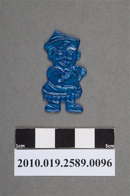 1.本物件為殭屍尪仔仙。硬質塑膠材質,扁平,單一藍色,雙面浮雕圖案,兩面圖案相同。圖案為Q版男性殭屍,因有橢圓形黑眼圈。其戴有官帽,官帽上貼有1張符咒,符咒揚起,身穿官服,胸前戴有朝珠。身體有些側身,雙手往前舉起。2.尪仔仙尺寸大致可分成小、中、大型,小型約長2-5公分,中型約長8-15公分,顏色以單色為主。有些大型的則可長達30公分左右,以菩薩、神仙和民間傳說故事人物等造型為主,塗上金銀紅黃彩漆等亮色。1960、70年代的尪仔仙多以民間傳說故事、歌仔戲、布袋戲人物為造型。1980年代改以卡通、電玩、漫畫人物造型為主。常見玩法之一為兩人(或多人)各持一只尪仔仙,輪流用手指彈射,看誰的尪仔仙先疊在對方上面,便可贏得對方用來對戰或是約定的尪仔仙。
