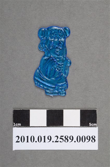 1.本物件為殭屍尪仔仙。硬質塑膠材質,扁平,單一藍色,雙面浮雕圖案,兩面圖案相同。圖案為Q版女性殭屍,因有橢圓形黑眼圈。其頭上綁有2個髮髻,有瀏海,身穿古代裙裝。雙手舉起,臀部往後翹。