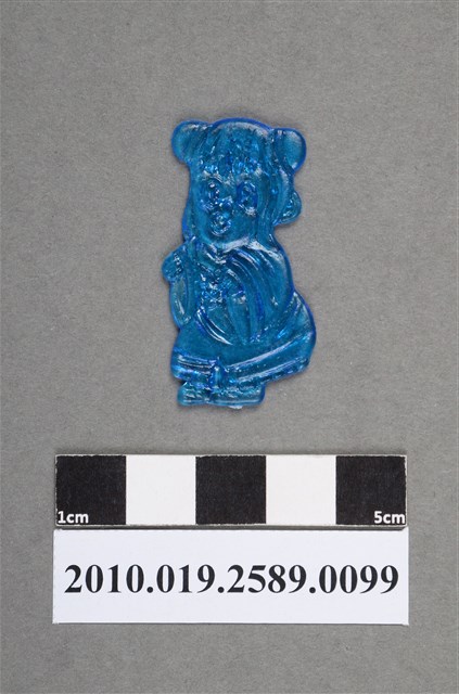 1.本物件為殭屍尪仔仙。硬質塑膠材質,扁平,單一藍色,雙面浮雕圖案,兩面圖案相同。圖案為Q版女性殭屍,因有橢圓形黑眼圈。其頭上綁有2個髮髻,有瀏海,身穿古代裙裝。雙手舉起,臀部往後翹。2.尪仔仙尺寸大致可分成小、中、大型,小型約長2-5公分,中型約長8-15公分,顏色以單色為主。有些大型的則可長達30公分左右,以菩薩、神仙和民間傳說故事人物等造型為主,塗上金銀紅黃彩漆等亮色。1960、70年代的尪仔仙多以民間傳說故事、歌仔戲、布袋戲人物為造型。1980年代改以卡通、電玩、漫畫人物造型為主。常見玩法之一為兩人(或多人)各持一只尪仔仙,輪流用手指彈射,看誰的尪仔仙先疊在對方上面,便可贏得對方用來對戰或是約定的尪仔仙。