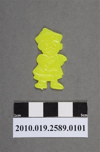 1.本物件為殭屍尪仔仙。硬質塑膠材質,扁平,單一不透明黃色,雙面浮雕圖案,兩面圖案相同。圖案為Q版男性殭屍,因有橢圓形黑眼圈。其戴有官帽,官帽上貼有1張符咒,符咒揚起,身穿官服,胸前戴有朝珠。身體有些側身,雙手往前舉起。2.尪仔仙尺寸大致可分成小、中、大型,小型約長2-5公分,中型約長8-15公分,顏色以單色為主。有些大型的則可長達30公分左右,以菩薩、神仙和民間傳說故事人物等造型為主,塗上金銀紅黃彩漆等亮色。1960、70年代的尪仔仙多以民間傳說故事、歌仔戲、布袋戲人物為造型。1980年代改以卡通、電玩、漫畫人物造型為主。常見玩法之一為兩人(或多人)各持一只尪仔仙,輪流用手指彈射,看誰的尪仔仙先疊在對方上面,便可贏得對方用來對戰或是約定的尪仔仙。
