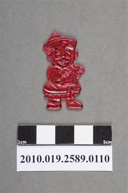 1.本物件為殭屍尪仔仙。硬質塑膠材質,扁平,單一紅色,雙面浮雕圖案,兩面圖案相同。圖案為Q版男性殭屍,因有橢圓形黑眼圈。其戴有官帽,官帽上貼有1張符咒,符咒揚起,身穿官服,胸前戴有朝珠。身體有些側身,雙手往前舉起。