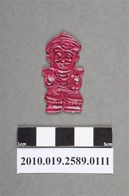1.本物件為殭屍尪仔仙。硬質塑膠材質,扁平,單一紅色,雙面浮雕圖案,兩面圖案相同。圖案為Q版男性殭屍,因有橢圓形黑眼圈。其嘴巴張開,表情呈高興貌,頭戴古代官帽,官帽上貼有1張符咒,符咒揚起,身穿古代官服,胸前有補子,身上掛有朝珠,雙手往前舉起。2.尪仔仙尺寸大致可分成小、中、大型,小型約長2-5公分,中型約長8-15公分,顏色以單色為主。有些大型的則可長達30公分左右,以菩薩、神仙和民間傳說故事人物等造型為主,塗上金銀紅黃彩漆等亮色。1960、70年代的尪仔仙多以民間傳說故事、歌仔戲、布袋戲人物為造型。1980年代改以卡通、電玩、漫畫人物造型為主。常見玩法之一為兩人(或多人)各持一只尪仔仙,輪流用手指彈射,看誰的尪仔仙先疊在對方上面,便可贏得對方用來對戰或是約定的尪仔仙。