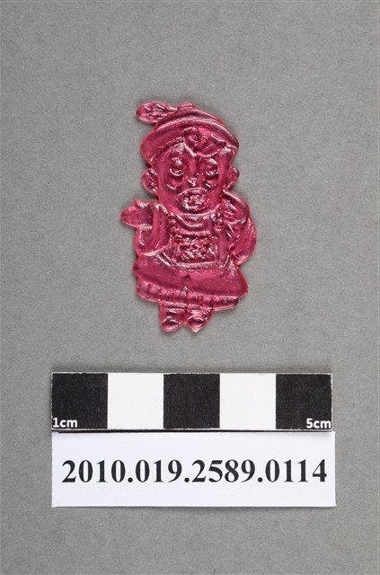 1.本物件為殭屍尪仔仙。硬質塑膠材質,扁平,單一紅色,雙面浮雕圖案,兩面圖案相同。圖案為Q版男性殭屍,因有橢圓形黑眼圈。其嘴巴張開,可見尖牙,頭戴古代官帽,官帽上貼有1張符咒,符咒揚起,身穿古代官服,胸前有補子,身上掛有朝珠。一手往旁邊舉,一手指向自己。2.尪仔仙尺寸大致可分成小、中、大型,小型約長2-5公分,中型約長8-15公分,顏色以單色為主。有些大型的則可長達30公分左右,以菩薩、神仙和民間傳說故事人物等造型為主,塗上金銀紅黃彩漆等亮色。1960、70年代的尪仔仙多以民間傳說故事、歌仔戲、布袋戲人物為造型。1980年代改以卡通、電玩、漫畫人物造型為主。常見玩法之一為兩人(或多人)各持一只尪仔仙,輪流用手指彈射,看誰的尪仔仙先疊在對方上面,便可贏得對方用來對戰或是約定的尪仔仙。