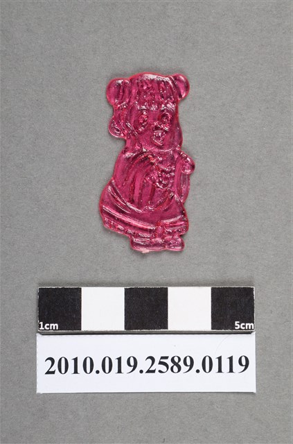 1.本物件為殭屍尪仔仙。硬質塑膠材質,扁平,單一紅色,雙面浮雕圖案,兩面圖案相同。圖案為Q版女性殭屍,因有橢圓形黑眼圈。其頭上綁有2個髮髻,有瀏海,身穿古代裙裝。雙手舉起,臀部往後翹。2.尪仔仙尺寸大致可分成小、中、大型,小型約長2-5公分,中型約長8-15公分,顏色以單色為主。有些大型的則可長達30公分左右,以菩薩、神仙和民間傳說故事人物等造型為主,塗上金銀紅黃彩漆等亮色。1960、70年代的尪仔仙多以民間傳說故事、歌仔戲、布袋戲人物為造型。1980年代改以卡通、電玩、漫畫人物造型為主。常見玩法之一為兩人(或多人)各持一只尪仔仙,輪流用手指彈射,看誰的尪仔仙先疊在對方上面,便可贏得對方用來對戰或是約定的尪仔仙。