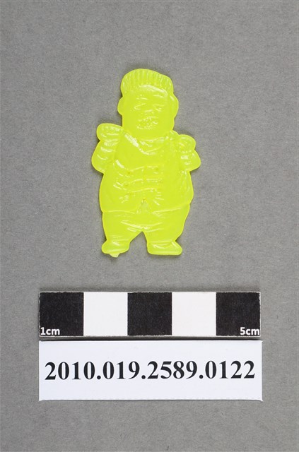 1.本物件為黃色人型尪仔仙。硬質塑膠材質,扁平,單一不透明黃色,雙面浮雕圖案,兩面圖案相同。圖案為站立男性,嘴巴張開,身材胖,服裝在肩膀上有裝飾,雙手放在背後。