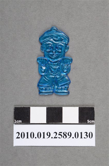 1.本物件為殭屍尪仔仙。硬質塑膠材質,扁平,單一藍色,雙面浮雕圖案,兩面圖案相同。圖案為Q版男性殭屍,因有橢圓形黑眼圈。其嘴巴張開,表情呈高興貌,頭戴古代官帽,官帽上貼有1張符咒,符咒揚起,身穿古代官服,胸前有補子,身上掛有朝珠,雙手往前舉起。2.尪仔仙尺寸大致可分成小、中、大型,小型約長2-5公分,中型約長8-15公分,顏色以單色為主。有些大型的則可長達30公分左右,以菩薩、神仙和民間傳說故事人物等造型為主,塗上金銀紅黃彩漆等亮色。1960、70年代的尪仔仙多以民間傳說故事、歌仔戲、布袋戲人物為造型。1980年代改以卡通、電玩、漫畫人物造型為主。常見玩法之一為兩人(或多人)各持一只尪仔仙,輪流用手指彈射,看誰的尪仔仙先疊在對方上面,便可贏得對方用來對戰或是約定的尪仔仙。