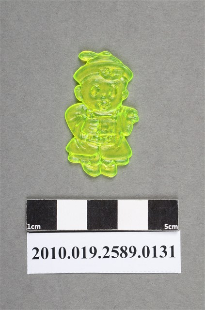 1.本物件為殭屍尪仔仙。硬質塑膠材質,扁平,單一黃色,雙面浮雕圖案,兩面圖案相同。圖案為Q版男性殭屍,因有橢圓形黑眼圈。其嘴巴張開,表情呈開心貌,頭戴古代官帽,官帽上貼有1張符咒,符咒揚起,身穿古代官服,胸前有補子,身上掛有朝珠。一手往前舉,一手放胸前,腳尖踮起。2.尪仔仙尺寸大致可分成小、中、大型,小型約長2-5公分,中型約長8-15公分,顏色以單色為主。有些大型的則可長達30公分左右,以菩薩、神仙和民間傳說故事人物等造型為主,塗上金銀紅黃彩漆等亮色。1960、70年代的尪仔仙多以民間傳說故事、歌仔戲、布袋戲人物為造型。1980年代改以卡通、電玩、漫畫人物造型為主。常見玩法之一為兩人(或多人)各持一只尪仔仙,輪流用手指彈射,看誰的尪仔仙先疊在對方上面,便可贏得對方用來對戰或是約定的尪仔仙。