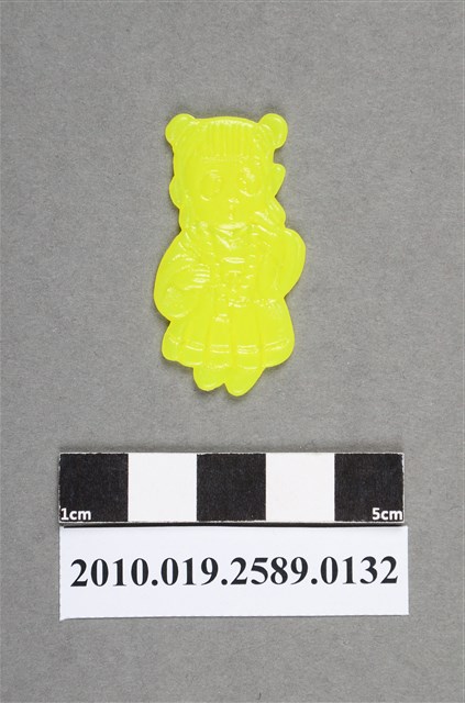 1.本物件為殭屍尪仔仙。硬質塑膠材質,扁平,單一不透明黃色,雙面浮雕圖案,兩面圖案相同。圖案為Q版女性殭屍,因有橢圓形黑眼圈。其頭上綁有2個髮髻,有瀏海,身穿古代裙裝,裙子有摺,胸前戴有1串長珠子。一手指著下臉頰,另一手放腰前,腳尖踮起。