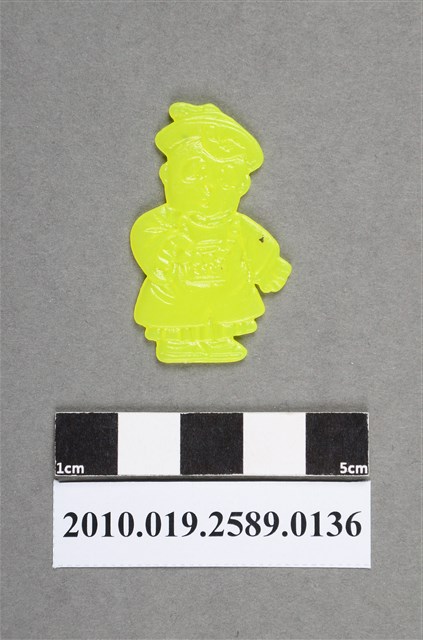 1.本物件為殭屍尪仔仙。硬質塑膠材質,扁平,單一不透明黃色,雙面浮雕圖案,兩面圖案相同。圖案為Q版男性殭屍,因有橢圓形黑眼圈。其表情呈現疑惑貌,頭戴古代官帽,官帽上貼有1張符咒,符咒揚起,身穿古代官服,胸前有補子,身上掛有朝珠。一手往前舉,一手垂下。2.尪仔仙尺寸大致可分成小、中、大型,小型約長2-5公分,中型約長8-15公分,顏色以單色為主。有些大型的則可長達30公分左右,以菩薩、神仙和民間傳說故事人物等造型為主,塗上金銀紅黃彩漆等亮色。1960、70年代的尪仔仙多以民間傳說故事、歌仔戲、布袋戲人物為造型。1980年代改以卡通、電玩、漫畫人物造型為主。常見玩法之一為兩人(或多人)各持一只尪仔仙,輪流用手指彈射,看誰的尪仔仙先疊在對方上面,便可贏得對方用來對戰或是約定的尪仔仙。