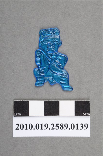 1.本物件為道士尪仔仙。硬質塑膠材質,扁平,單一藍色,雙面浮雕圖案,兩面圖案相同。圖案為道士,其頭戴斜頂道冠,身穿道袍,一手拿劍,雙腳微蹲,呈戰鬥姿勢。