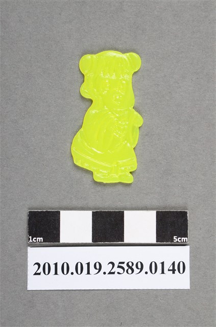 1.本物件為殭屍尪仔仙。硬質塑膠材質,扁平,單一不透明黃色,雙面浮雕圖案,兩面圖案相同。圖案為Q版女性殭屍,因有橢圓形黑眼圈。其頭上綁有2個髮髻,有瀏海,身穿古代裙裝。雙手舉起,臀部往後翹。