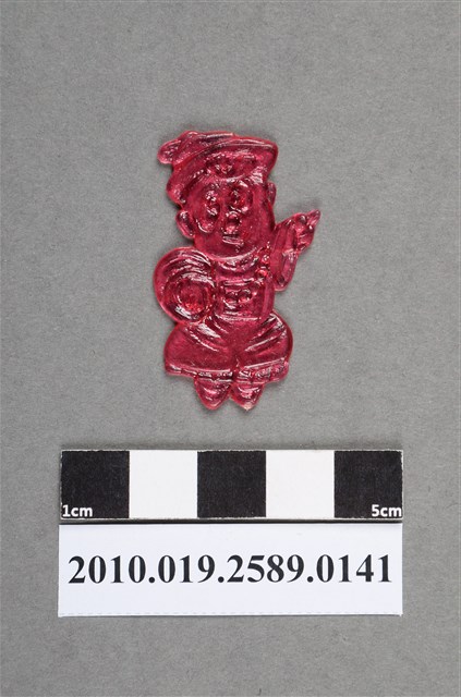 1.本物件為殭屍尪仔仙。硬質塑膠材質,扁平,單一紅色,雙面浮雕圖案,兩面圖案相同。圖案為Q版男性殭屍,因有橢圓形黑眼圈。其頭部稍歪一邊,頭戴古代官帽,官帽上貼有1張符咒,符咒揚起,身穿古代官服,胸前有補子,身上掛有朝珠。一手往前舉,另一手往上舉,食指伸出,腳尖踮起。2.尪仔仙尺寸大致可分成小、中、大型,小型約長2-5公分,中型約長8-15公分,顏色以單色為主。有些大型的則可長達30公分左右,以菩薩、神仙和民間傳說故事人物等造型為主,塗上金銀紅黃彩漆等亮色。1960、70年代的尪仔仙多以民間傳說故事、歌仔戲、布袋戲人物為造型。1980年代改以卡通、電玩、漫畫人物造型為主。常見玩法之一為兩人(或多人)各持一只尪仔仙,輪流用手指彈射,看誰的尪仔仙先疊在對方上面,便可贏得對方用來對戰或是約定的尪仔仙。