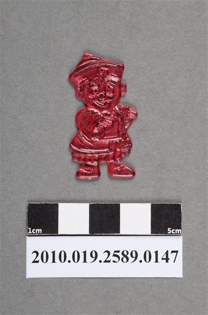 1.本物件為殭屍尪仔仙。硬質塑膠材質,扁平,單一紅色,雙面浮雕圖案,兩面圖案相同。圖案為Q版男性殭屍,因有橢圓形黑眼圈。其戴有官帽,官帽上貼有1張符咒,符咒揚起,身穿官服,胸前戴有朝珠。身體有些側身,雙手往前舉起。