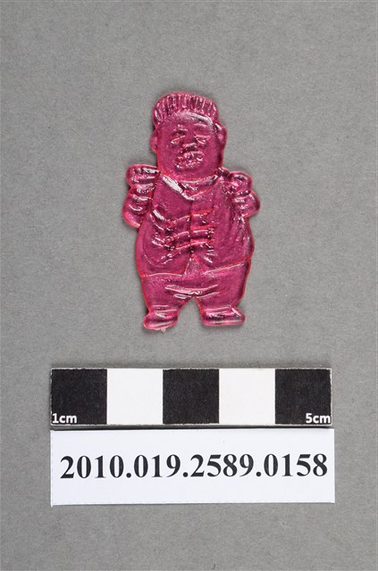 1.本物件為紅色人型尪仔仙。硬質塑膠材質,扁平,單一紅色,雙面浮雕圖案,兩面圖案相同。圖案為站立男性,嘴巴張開,身材胖,服裝在肩膀上有裝飾,雙手放在背後。2.尪仔仙尺寸大致可分成小、中、大型,小型約長2-5公分,中型約長8-15公分,顏色以單色為主。有些大型的則可長達30公分左右,以菩薩、神仙和民間傳說故事人物等造型為主,塗上金銀紅黃彩漆等亮色。1960、70年代的尪仔仙多以民間傳說故事、歌仔戲、布袋戲人物為造型。1980年代改以卡通、電玩、漫畫人物造型為主。常見玩法之一為兩人(或多人)各持一只尪仔仙,輪流用手指彈射,看誰的尪仔仙先疊在對方上面,便可贏得對方用來對戰或是約定的尪仔仙。