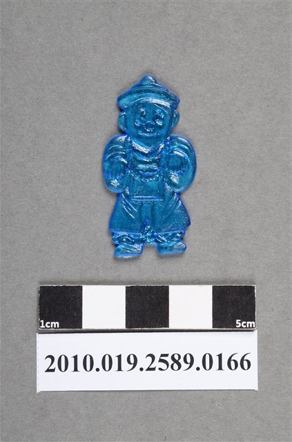1.本物件為殭屍尪仔仙。硬質塑膠材質,扁平,單一藍色,雙面浮雕圖案,兩面圖案相同。圖案為Q版男性殭屍,因有橢圓形黑眼圈。其表情呈委屈貌,黑眼圈上有表情紋,戴有官帽,身穿官服,胸前有補子,戴有朝珠,雙手往前舉起。2.尪仔仙尺寸大致可分成小、中、大型,小型約長2-5公分,中型約長8-15公分,顏色以單色為主。有些大型的則可長達30公分左右,以菩薩、神仙和民間傳說故事人物等造型為主,塗上金銀紅黃彩漆等亮色。1960、70年代的尪仔仙多以民間傳說故事、歌仔戲、布袋戲人物為造型。1980年代改以卡通、電玩、漫畫人物造型為主。常見玩法之一為兩人(或多人)各持一只尪仔仙,輪流用手指彈射,看誰的尪仔仙先疊在對方上面,便可贏得對方用來對戰或是約定的尪仔仙。
