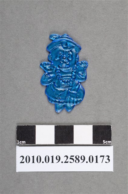1.本物件為殭屍尪仔仙。硬質塑膠材質,扁平,單一藍色,雙面浮雕圖案,兩面圖案相同。圖案為Q版男性殭屍,因有橢圓形黑眼圈。其嘴巴張開,可見尖牙,表情呈驚慌貌,戴有官帽,官帽上貼有1張符咒,符咒揚起,身穿官服,胸前戴有朝珠。雙手往前舉起,腳尖踮起,整體呈現跳動感覺。2.尪仔仙尺寸大致可分成小、中、大型,小型約長2-5公分,中型約長8-15公分,顏色以單色為主。有些大型的則可長達30公分左右,以菩薩、神仙和民間傳說故事人物等造型為主,塗上金銀紅黃彩漆等亮色。1960、70年代的尪仔仙多以民間傳說故事、歌仔戲、布袋戲人物為造型。1980年代改以卡通、電玩、漫畫人物造型為主。常見玩法之一為兩人(或多人)各持一只尪仔仙,輪流用手指彈射,看誰的尪仔仙先疊在對方上面,便可贏得對方用來對戰或是約定的尪仔仙。