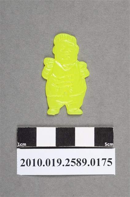 1.本物件為黃色人型尪仔仙。硬質塑膠材質,扁平,單一不透明黃色,雙面浮雕圖案,兩面圖案相同。圖案為站立男性,嘴巴張開,身材胖,服裝在肩膀上有裝飾,雙手放在背後。