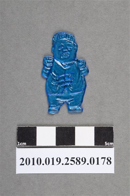1.本物件為藍色人型尪仔仙。硬質塑膠材質,扁平,單一藍色,雙面浮雕圖案,兩面圖案相同。圖案為站立男性,嘴巴張開,身材胖,服裝在肩膀上有裝飾,雙手放在背後。2.尪仔仙尺寸大致可分成小、中、大型,小型約長2-5公分,中型約長8-15公分,顏色以單色為主。有些大型的則可長達30公分左右,以菩薩、神仙和民間傳說故事人物等造型為主,塗上金銀紅黃彩漆等亮色。1960、70年代的尪仔仙多以民間傳說故事、歌仔戲、布袋戲人物為造型。1980年代改以卡通、電玩、漫畫人物造型為主。常見玩法之一為兩人(或多人)各持一只尪仔仙,輪流用手指彈射,看誰的尪仔仙先疊在對方上面,便可贏得對方用來對戰或是約定的尪仔仙。