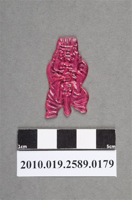 1.本物件為道士尪仔仙。硬質塑膠材質,扁平,單一紅色,雙面浮雕圖案,兩面圖案相同。圖案為站立的道士,頭戴斜頂道冠,表情嚴肅,雙手握著劍柄,劍尖抵地,一腳尖踮起。2.尪仔仙尺寸大致可分成小、中、大型,小型約長2-5公分,中型約長8-15公分,顏色以單色為主。有些大型的則可長達30公分左右,以菩薩、神仙和民間傳說故事人物等造型為主,塗上金銀紅黃彩漆等亮色。1960、70年代的尪仔仙多以民間傳說故事、歌仔戲、布袋戲人物為造型。1980年代改以卡通、電玩、漫畫人物造型為主。常見玩法之一為兩人(或多人)各持一只尪仔仙,輪流用手指彈射,看誰的尪仔仙先疊在對方上面,便可贏得對方用來對戰或是約定的尪仔仙。