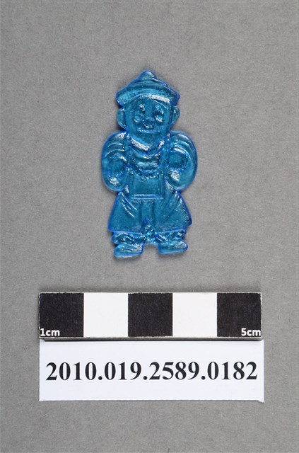 1.本物件為殭屍尪仔仙。硬質塑膠材質,扁平,單一藍色,雙面浮雕圖案,兩面圖案相同。圖案為Q版男性殭屍,因有橢圓形黑眼圈。其表情呈委屈貌,黑眼圈上有表情紋,戴有官帽,身穿官服,胸前有補子,戴有朝珠,雙手往前舉起。2.尪仔仙尺寸大致可分成小、中、大型,小型約長2-5公分,中型約長8-15公分,顏色以單色為主。有些大型的則可長達30公分左右,以菩薩、神仙和民間傳說故事人物等造型為主,塗上金銀紅黃彩漆等亮色。1960、70年代的尪仔仙多以民間傳說故事、歌仔戲、布袋戲人物為造型。1980年代改以卡通、電玩、漫畫人物造型為主。常見玩法之一為兩人(或多人)各持一只尪仔仙,輪流用手指彈射,看誰的尪仔仙先疊在對方上面,便可贏得對方用來對戰或是約定的尪仔仙。