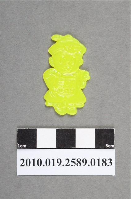 1.本物件為殭屍尪仔仙。硬質塑膠材質,扁平,單一不透明黃色,雙面浮雕圖案,兩面圖案相同。圖案為Q版男性殭屍,因有橢圓形黑眼圈。其嘴巴張開,表情呈開心貌,頭戴古代官帽,官帽上貼有1張符咒,符咒揚起,身穿古代官服,胸前有補子,身上掛有朝珠。一手往前舉,一手放胸前,腳尖踮起。
