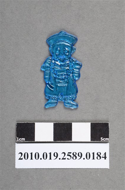 1.本物件為殭屍尪仔仙。硬質塑膠材質,扁平,單一藍色,雙面浮雕圖案,兩面圖案相同。圖案為Q版男性殭屍,因有橢圓形黑眼圈。其戴有官帽,口吐舌頭,身穿官服,胸前有補子,戴有朝珠,雙手往前舉起。2.尪仔仙尺寸大致可分成小、中、大型,小型約長2-5公分,中型約長8-15公分,顏色以單色為主。有些大型的則可長達30公分左右,以菩薩、神仙和民間傳說故事人物等造型為主,塗上金銀紅黃彩漆等亮色。1960、70年代的尪仔仙多以民間傳說故事、歌仔戲、布袋戲人物為造型。1980年代改以卡通、電玩、漫畫人物造型為主。常見玩法之一為兩人(或多人)各持一只尪仔仙,輪流用手指彈射,看誰的尪仔仙先疊在對方上面,便可贏得對方用來對戰或是約定的尪仔仙。