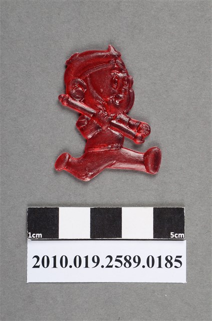 1.本物件為孫悟空尪仔仙。硬質塑膠材質,扁平,單一不透明紅色,雙面浮雕圖案,兩面圖案相同。圖案為Q版頭戴金箍的孫悟空,肩上扛著金箍棒,呈跑步姿勢。孫悟空為西遊記之角色。2.西遊記為明代吳承恩所作。內容為敘述孫悟空自大鬧天宮後,和豬八戒、沙悟淨保護唐三藏去西天取經,路上降妖伏魔,終成正果。3.尪仔仙尺寸大致可分成小、中、大型,小型約長2-5公分,中型約長8-15公分,顏色以單色為主。有些大型的則可長達30公分左右,以菩薩、神仙和民間傳說故事人物等造型為主,塗上金銀紅黃彩漆等亮色。1960、70年代的尪仔仙多以民間傳說故事、歌仔戲、布袋戲人物為造型。1980年代改以卡通、電玩、漫畫人物造型為主。常見玩法之一為兩人(或多人)各持一只尪仔仙,輪流用手指彈射,看誰的尪仔仙先疊在對方上面,便可贏得對方用來對戰或是約定的尪仔仙。