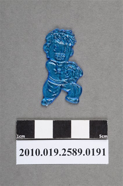 1.本物件為持圓形物人型尪仔仙。硬質塑膠材質,扁平,單一藍色,雙面浮雕圖案,兩面圖案相同。圖案為站立男性,嘴巴張開,雙手拿住圓形物品放在胸前,一腳膝蓋彎曲。2.尪仔仙尺寸大致可分成小、中、大型,小型約長2-5公分,中型約長8-15公分,顏色以單色為主。有些大型的則可長達30公分左右,以菩薩、神仙和民間傳說故事人物等造型為主,塗上金銀紅黃彩漆等亮色。1960、70年代的尪仔仙多以民間傳說故事、歌仔戲、布袋戲人物為造型。1980年代改以卡通、電玩、漫畫人物造型為主。常見玩法之一為兩人(或多人)各持一只尪仔仙,輪流用手指彈射,看誰的尪仔仙先疊在對方上面,便可贏得對方用來對戰或是約定的尪仔仙。