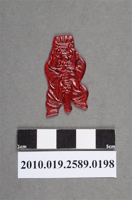 1.本物件為道士尪仔仙。硬質塑膠材質,扁平,單一紅色,雙面浮雕圖案,兩面圖案相同。圖案為站立的道士,頭戴斜頂道冠,表情嚴肅,雙手握著劍柄,劍尖抵地,一腳尖踮起。2.尪仔仙尺寸大致可分成小、中、大型,小型約長2-5公分,中型約長8-15公分,顏色以單色為主。有些大型的則可長達30公分左右,以菩薩、神仙和民間傳說故事人物等造型為主,塗上金銀紅黃彩漆等亮色。1960、70年代的尪仔仙多以民間傳說故事、歌仔戲、布袋戲人物為造型。1980年代改以卡通、電玩、漫畫人物造型為主。常見玩法之一為兩人(或多人)各持一只尪仔仙,輪流用手指彈射,看誰的尪仔仙先疊在對方上面,便可贏得對方用來對戰或是約定的尪仔仙。
