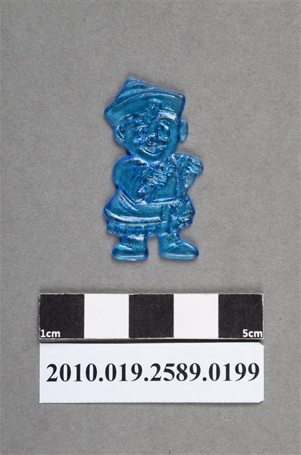 1.本物件為殭屍尪仔仙。硬質塑膠材質,扁平,單一藍色,雙面浮雕圖案,兩面圖案相同。圖案為Q版男性殭屍,因有橢圓形黑眼圈。其戴有官帽,官帽上貼有1張符咒,符咒揚起,身穿官服,胸前戴有朝珠。身體有些側身,雙手往前舉起。2.尪仔仙尺寸大致可分成小、中、大型,小型約長2-5公分,中型約長8-15公分,顏色以單色為主。有些大型的則可長達30公分左右,以菩薩、神仙和民間傳說故事人物等造型為主,塗上金銀紅黃彩漆等亮色。1960、70年代的尪仔仙多以民間傳說故事、歌仔戲、布袋戲人物為造型。1980年代改以卡通、電玩、漫畫人物造型為主。常見玩法之一為兩人(或多人)各持一只尪仔仙,輪流用手指彈射,看誰的尪仔仙先疊在對方上面,便可贏得對方用來對戰或是約定的尪仔仙。