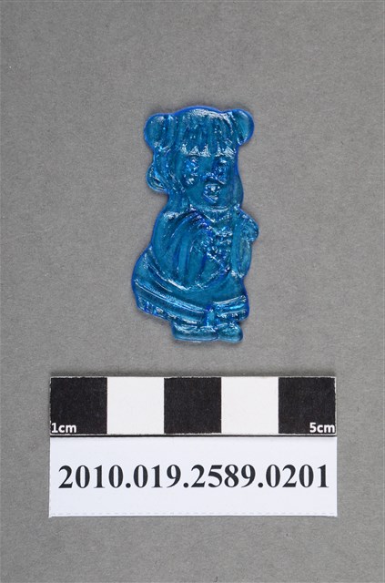 1.本物件為殭屍尪仔仙。硬質塑膠材質,扁平,單一藍色,雙面浮雕圖案,兩面圖案相同。圖案為Q版女性殭屍,因有橢圓形黑眼圈。其頭上綁有2個髮髻,有瀏海,身穿古代裙裝。雙手舉起,臀部往後翹。2.尪仔仙尺寸大致可分成小、中、大型,小型約長2-5公分,中型約長8-15公分,顏色以單色為主。有些大型的則可長達30公分左右,以菩薩、神仙和民間傳說故事人物等造型為主,塗上金銀紅黃彩漆等亮色。1960、70年代的尪仔仙多以民間傳說故事、歌仔戲、布袋戲人物為造型。1980年代改以卡通、電玩、漫畫人物造型為主。常見玩法之一為兩人(或多人)各持一只尪仔仙,輪流用手指彈射,看誰的尪仔仙先疊在對方上面,便可贏得對方用來對戰或是約定的尪仔仙。