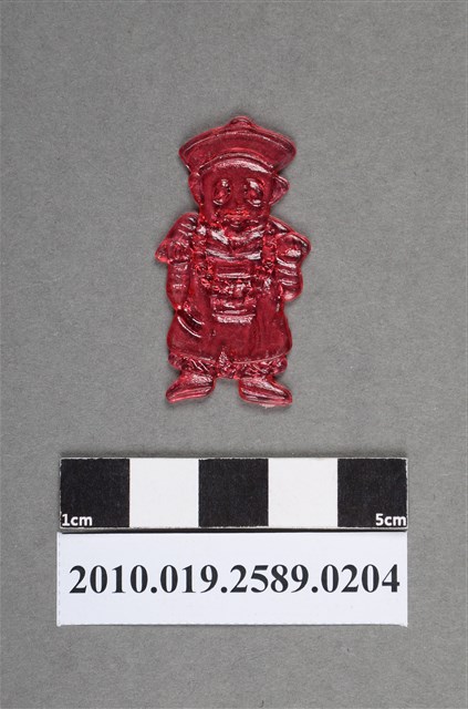1.本物件為殭屍尪仔仙。硬質塑膠材質,扁平,單一紅色,雙面浮雕圖案,兩面圖案相同。圖案為Q版男性殭屍,因有橢圓形黑眼圈。其戴有官帽,口吐舌頭,身穿官服,胸前有補子,戴有朝珠,雙手往前舉起。