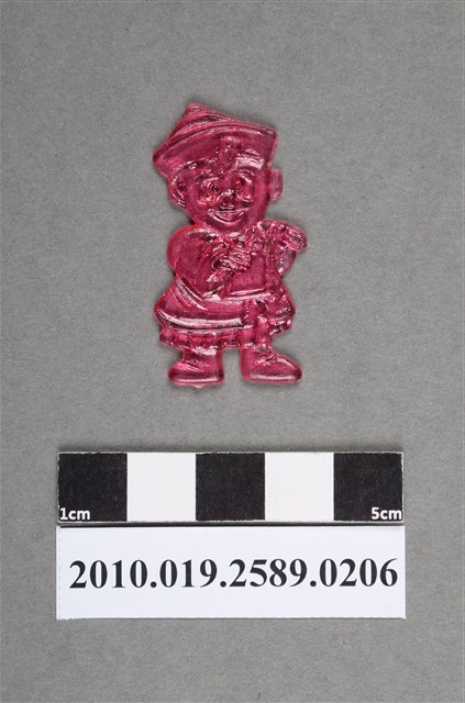 1.本物件為殭屍尪仔仙。硬質塑膠材質,扁平,單一紅色,雙面浮雕圖案,兩面圖案相同。圖案為Q版男性殭屍,因有橢圓形黑眼圈。其戴有官帽,官帽上貼有1張符咒,符咒揚起,身穿官服,胸前戴有朝珠。身體有些側身,雙手往前舉起。