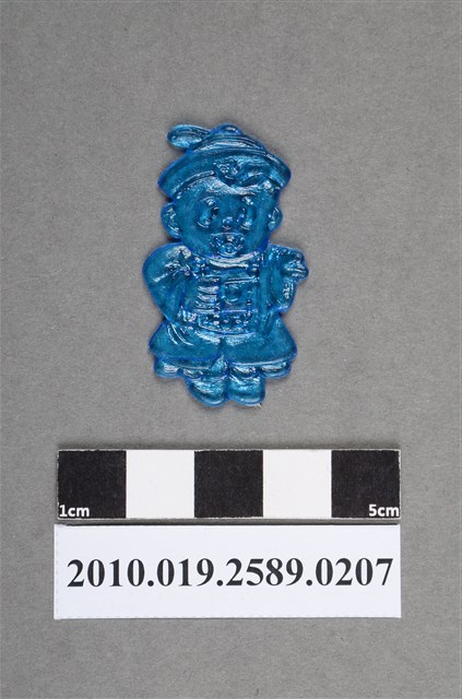 1.本物件為殭屍尪仔仙。硬質塑膠材質,扁平,單一藍色,雙面浮雕圖案,兩面圖案相同。圖案為Q版男性殭屍,因有橢圓形黑眼圈。其嘴巴張開,表情呈開心貌,頭戴古代官帽,官帽上貼有1張符咒,符咒揚起,身穿古代官服,胸前有補子,身上掛有朝珠。一手往前舉,一手放胸前,腳尖踮起。2.尪仔仙尺寸大致可分成小、中、大型,小型約長2-5公分,中型約長8-15公分,顏色以單色為主。有些大型的則可長達30公分左右,以菩薩、神仙和民間傳說故事人物等造型為主,塗上金銀紅黃彩漆等亮色。1960、70年代的尪仔仙多以民間傳說故事、歌仔戲、布袋戲人物為造型。1980年代改以卡通、電玩、漫畫人物造型為主。常見玩法之一為兩人(或多人)各持一只尪仔仙,輪流用手指彈射,看誰的尪仔仙先疊在對方上面,便可贏得對方用來對戰或是約定的尪仔仙。