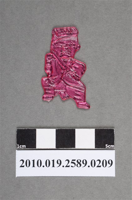 1.本物件為道士尪仔仙。硬質塑膠材質,扁平,單一紅色,雙面浮雕圖案,兩面圖案相同。圖案為道士,其頭戴斜頂道冠,身穿道袍,一手拿劍,雙腳微蹲,呈戰鬥姿勢。2.尪仔仙尺寸大致可分成小、中、大型,小型約長2-5公分,中型約長8-15公分,顏色以單色為主。有些大型的則可長達30公分左右,以菩薩、神仙和民間傳說故事人物等造型為主,塗上金銀紅黃彩漆等亮色。1960、70年代的尪仔仙多以民間傳說故事、歌仔戲、布袋戲人物為造型。1980年代改以卡通、電玩、漫畫人物造型為主。常見玩法之一為兩人(或多人)各持一只尪仔仙,輪流用手指彈射,看誰的尪仔仙先疊在對方上面,便可贏得對方用來對戰或是約定的尪仔仙。