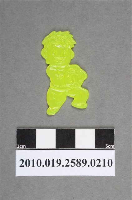 1.本物件為持圓形物人型尪仔仙。硬質塑膠材質,扁平,單一不透明黃色,雙面浮雕圖案,兩面圖案相同。圖案為站立男性,嘴巴張開,雙手拿住圓形物品放在胸前,一腳膝蓋彎曲。2.尪仔仙尺寸大致可分成小、中、大型,小型約長2-5公分,中型約長8-15公分,顏色以單色為主。有些大型的則可長達30公分左右,以菩薩、神仙和民間傳說故事人物等造型為主,塗上金銀紅黃彩漆等亮色。1960、70年代的尪仔仙多以民間傳說故事、歌仔戲、布袋戲人物為造型。1980年代改以卡通、電玩、漫畫人物造型為主。常見玩法之一為兩人(或多人)各持一只尪仔仙,輪流用手指彈射,看誰的尪仔仙先疊在對方上面,便可贏得對方用來對戰或是約定的尪仔仙。