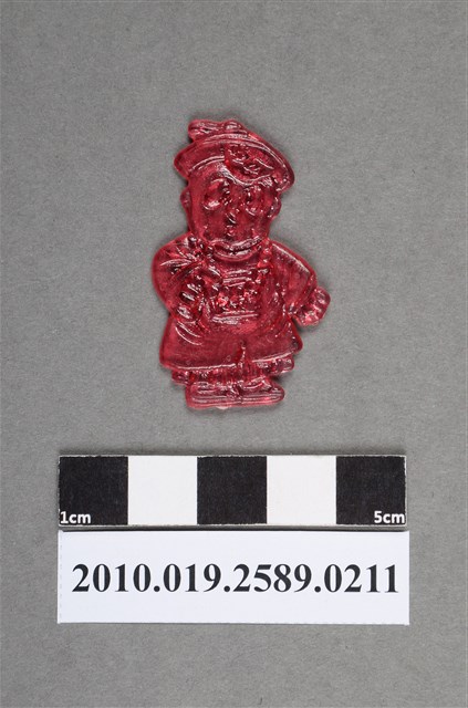 1.本物件為殭屍尪仔仙。硬質塑膠材質,扁平,單一紅色,雙面浮雕圖案,兩面圖案相同。圖案為Q版男性殭屍,因有橢圓形黑眼圈。其表情呈現疑惑貌,頭戴古代官帽,官帽上貼有1張符咒,符咒揚起,身穿古代官服,胸前有補子,身上掛有朝珠。一手往前舉,一手垂下。2.尪仔仙尺寸大致可分成小、中、大型,小型約長2-5公分,中型約長8-15公分,顏色以單色為主。有些大型的則可長達30公分左右,以菩薩、神仙和民間傳說故事人物等造型為主,塗上金銀紅黃彩漆等亮色。1960、70年代的尪仔仙多以民間傳說故事、歌仔戲、布袋戲人物為造型。1980年代改以卡通、電玩、漫畫人物造型為主。常見玩法之一為兩人(或多人)各持一只尪仔仙,輪流用手指彈射,看誰的尪仔仙先疊在對方上面,便可贏得對方用來對戰或是約定的尪仔仙。