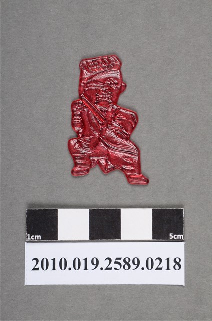 1.本物件為道士尪仔仙。硬質塑膠材質,扁平,單一紅色,雙面浮雕圖案,兩面圖案相同。圖案為道士,其頭戴斜頂道冠,身穿道袍,一手拿劍,雙腳微蹲,呈戰鬥姿勢。2.尪仔仙尺寸大致可分成小、中、大型,小型約長2-5公分,中型約長8-15公分,顏色以單色為主。有些大型的則可長達30公分左右,以菩薩、神仙和民間傳說故事人物等造型為主,塗上金銀紅黃彩漆等亮色。1960、70年代的尪仔仙多以民間傳說故事、歌仔戲、布袋戲人物為造型。1980年代改以卡通、電玩、漫畫人物造型為主。常見玩法之一為兩人(或多人)各持一只尪仔仙,輪流用手指彈射,看誰的尪仔仙先疊在對方上面,便可贏得對方用來對戰或是約定的尪仔仙。