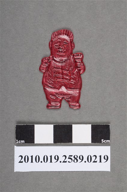 1.本物件為紅色人型尪仔仙。硬質塑膠材質,扁平,單一紅色,雙面浮雕圖案,兩面圖案相同。圖案為站立男性,嘴巴張開,身材胖,服裝在肩膀上有裝飾,雙手放在背後。2.尪仔仙尺寸大致可分成小、中、大型,小型約長2-5公分,中型約長8-15公分,顏色以單色為主。有些大型的則可長達30公分左右,以菩薩、神仙和民間傳說故事人物等造型為主,塗上金銀紅黃彩漆等亮色。1960、70年代的尪仔仙多以民間傳說故事、歌仔戲、布袋戲人物為造型。1980年代改以卡通、電玩、漫畫人物造型為主。常見玩法之一為兩人(或多人)各持一只尪仔仙,輪流用手指彈射,看誰的尪仔仙先疊在對方上面,便可贏得對方用來對戰或是約定的尪仔仙。