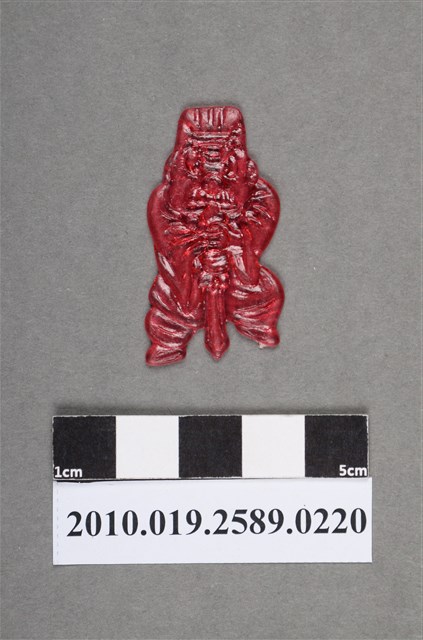 1.本物件為道士尪仔仙。硬質塑膠材質,扁平,單一紅色,雙面浮雕圖案,兩面圖案相同。圖案為站立的道士,頭戴斜頂道冠,表情嚴肅,雙手握著劍柄,劍尖抵地,一腳尖踮起。2.尪仔仙尺寸大致可分成小、中、大型,小型約長2-5公分,中型約長8-15公分,顏色以單色為主。有些大型的則可長達30公分左右,以菩薩、神仙和民間傳說故事人物等造型為主,塗上金銀紅黃彩漆等亮色。1960、70年代的尪仔仙多以民間傳說故事、歌仔戲、布袋戲人物為造型。1980年代改以卡通、電玩、漫畫人物造型為主。常見玩法之一為兩人(或多人)各持一只尪仔仙,輪流用手指彈射,看誰的尪仔仙先疊在對方上面,便可贏得對方用來對戰或是約定的尪仔仙。