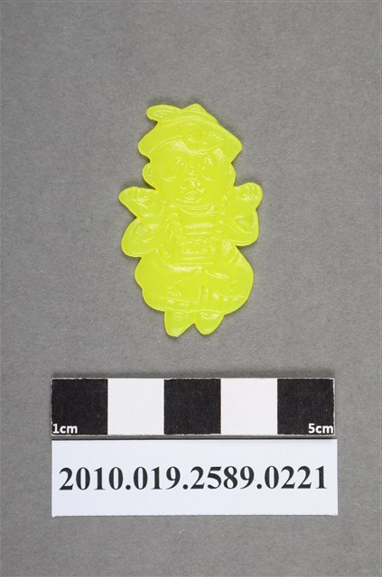 1.本物件為殭屍尪仔仙。硬質塑膠材質,扁平,單一不透明黃色,雙面浮雕圖案,兩面圖案相同。圖案為Q版男性殭屍,因有橢圓形黑眼圈。其嘴巴張開,可見尖牙,表情呈驚慌貌,戴有官帽,官帽上貼有1張符咒,符咒揚起,身穿官服,胸前戴有朝珠。雙手往前舉起,腳尖踮起,整體呈現跳動感覺。2.尪仔仙尺寸大致可分成小、中、大型,小型約長2-5公分,中型約長8-15公分,顏色以單色為主。有些大型的則可長達30公分左右,以菩薩、神仙和民間傳說故事人物等造型為主,塗上金銀紅黃彩漆等亮色。1960、70年代的尪仔仙多以民間傳說故事、歌仔戲、布袋戲人物為造型。1980年代改以卡通、電玩、漫畫人物造型為主。常見玩法之一為兩人(或多人)各持一只尪仔仙,輪流用手指彈射,看誰的尪仔仙先疊在對方上面,便可贏得對方用來對戰或是約定的尪仔仙。